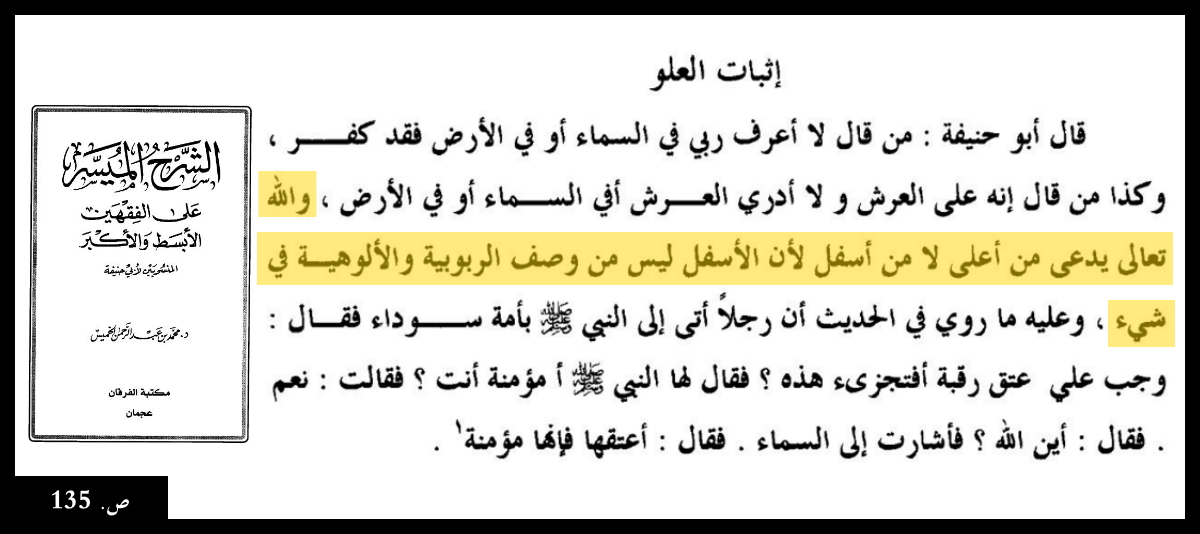 In the book الفقه الأبسط attributed to Abū Ḥanīfa al-Nuʿmān b. Thābit b. Zūṭā b. Marzubān (d. 150AH / 767), he affirmed the Aboveness of Allah as it would be unbefitting to realize Allah’s Lordship or Allah’s Oneness of Worship without affirming this attribute, using the same terms commonly used today.