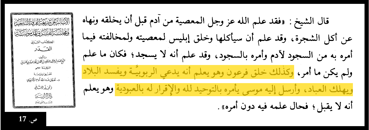 He also created Pharaoh and He knew he would claim Lordship and corrupt the lands and destroy the people, and sent Moses to command him to realize Tawheed and to affirm Allah’s Oneness of Worship and He knew he would not submit, thus realizing what He knew but not what He commanded.5