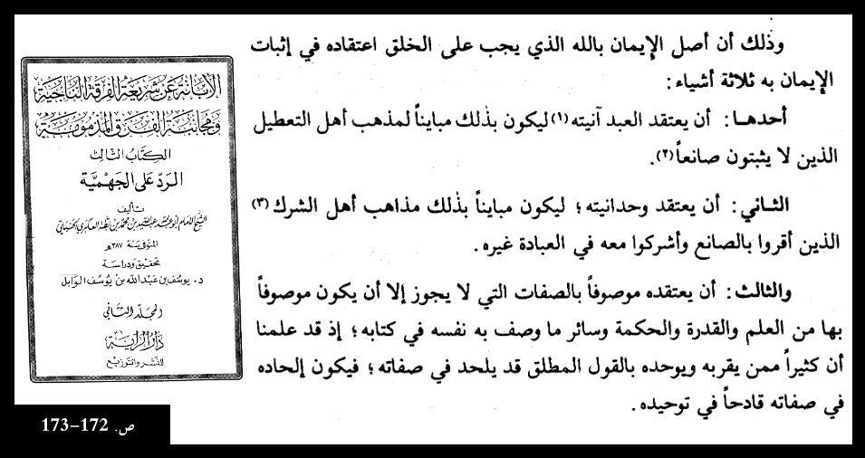الإبانة عن شريعة الفرقة الناجية ومجانبة الفرق المذمومة, الكتاب الثالث, المجلد الثاني ص. 172-173 ↩